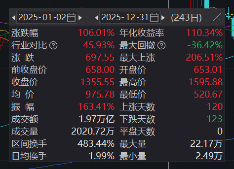 2025年,寒武纪股价大涨106.01%,其股价一度攀升至A股第一成为新晋“股王”。