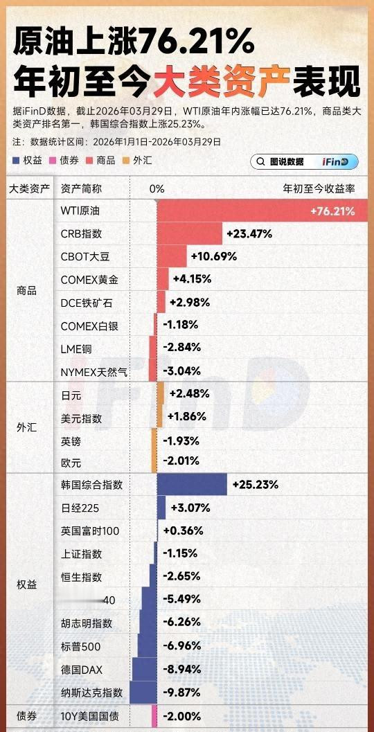 2026岁首于今,巨匠财富商场演绎了一场极具戏剧性的“分化大戏”。据iFinD数据涌现,WTI原油以年内76.21%的惊东谈主涨幅一骑绝尘,毫无悬念地摘得大类财富桂冠。在商品范畴,动力与农产物进展拉风,而权柄商场则在震撼中呈现出显赫的区域分化,韩国综指逆势领涨,好意思股则堕入回调。