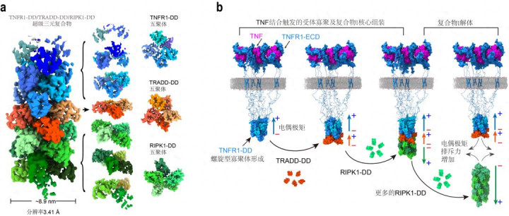 结构分析和突变体功能探求标明,来自TNFR1、TRADD和RIPK1的三类弃世结构域通过精湛互补的静电名义,酿成特异性互相作用,最终拼装成高度有序的螺旋型复合物。