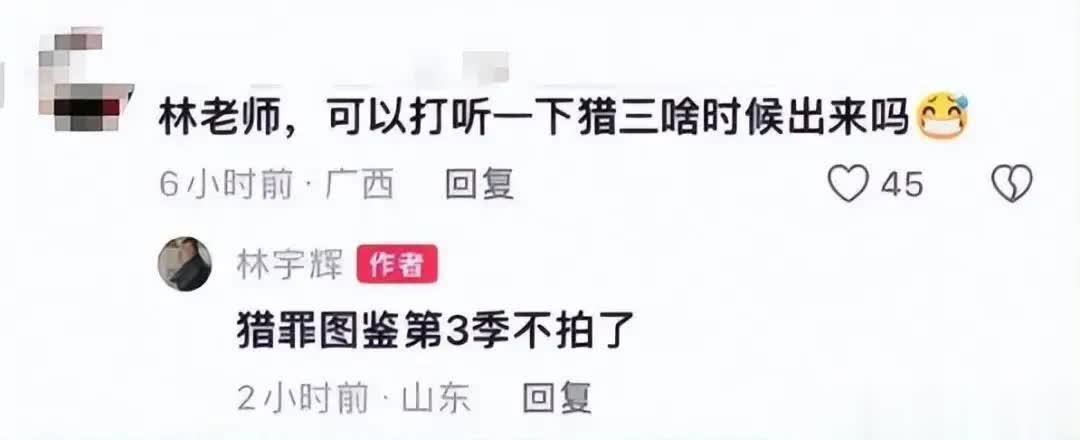 4月6日,曾在《猎罪图鉴》系列中担任本领参谋人,同期亦然该剧主角“沈翊”现实原型的模拟画像众人林宇辉,在应酬平台回答网友发问时,明确示意“第三季不拍了”。