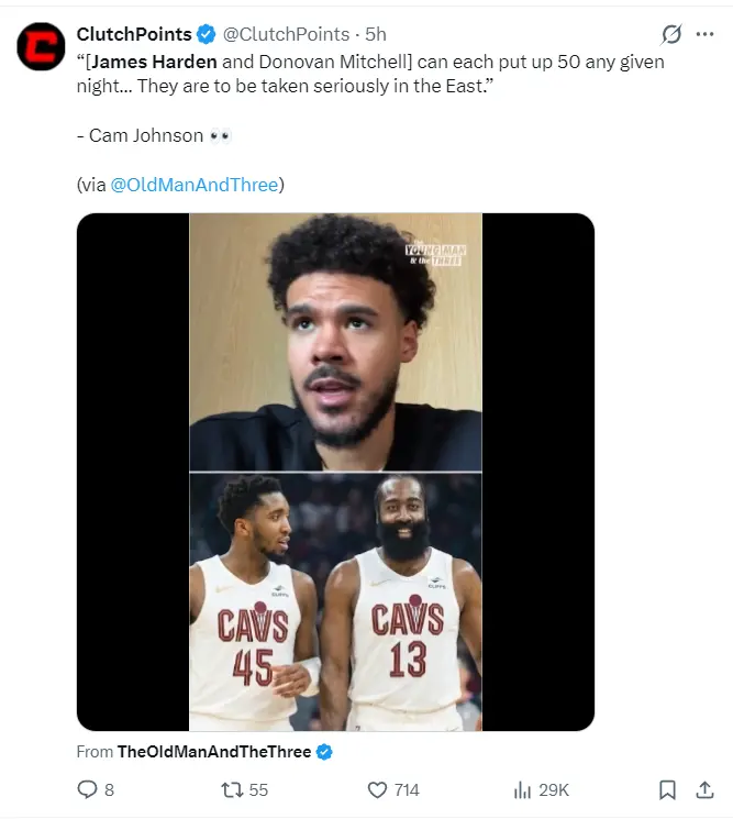 掘金球员卡梅伦-约翰斯在直播时谈到哈登+米切尔的组合,他暗示:骑士队会变得绝顶宽广,因为哈登、米切尔两东谈主都是不错一场50+的球员,米登组合会绝顶之恐怖。