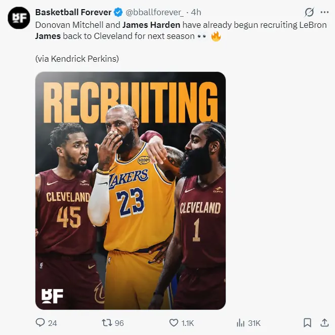 帕金斯还知道一个细节,在今夏休赛期,米切尔与哈登两东谈主都会来劝服詹姆斯签约克利夫兰,各人一王人冲击总冠军。