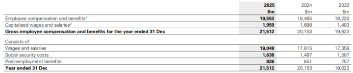 汇丰英文版年报泄漏,2025年职工薪酬及福利总额达到215.12亿好意思元,占收入比例升至31.51%。