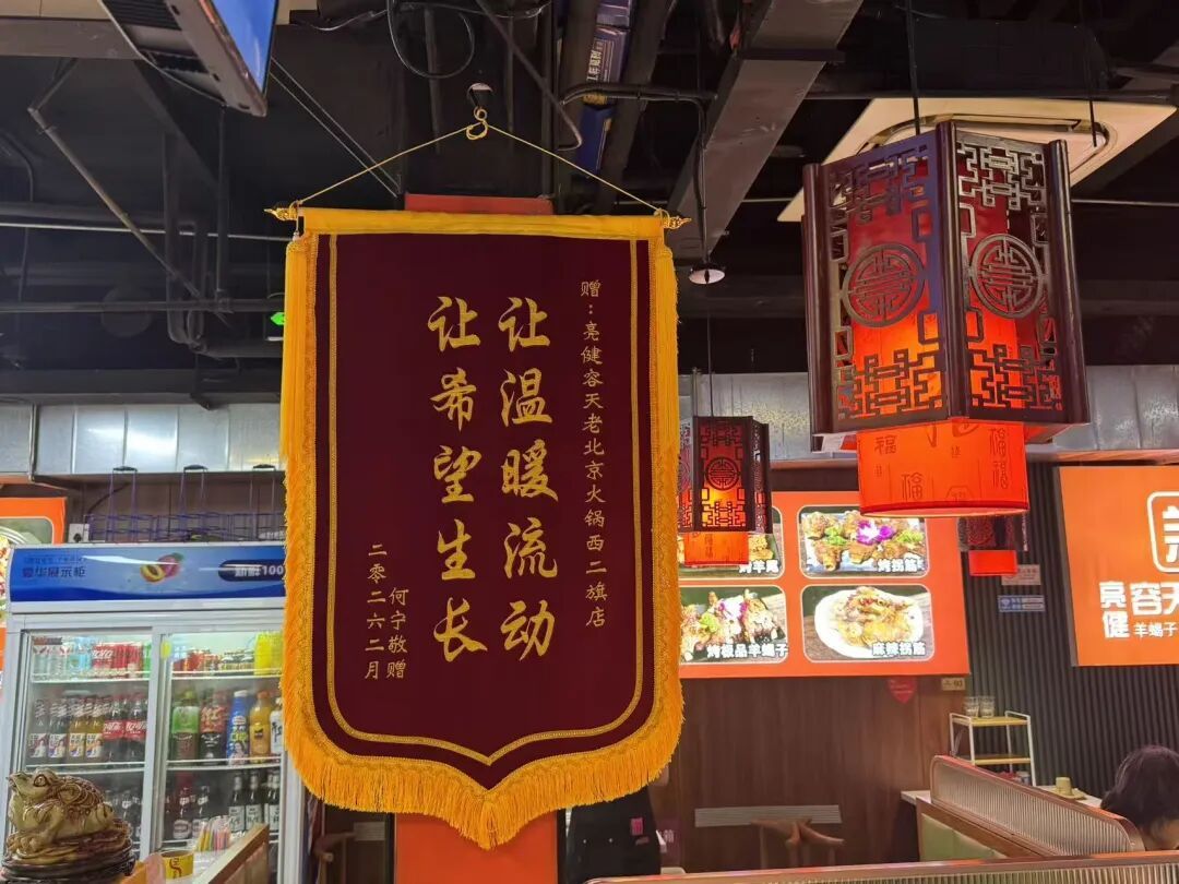 走进亮健容天老北京羊蝎子暖锅西二旗店,店两侧吊挂着“都鲁好儿子”“东谈主民英雄”“舍己救东谈主”等十多幅锦旗和字画作品。跟着夜幕驾临,店内主顾冉冉增加,不到晚6时店外一经排起了队。还有的主顾用餐约束后,会在店门外拍照眷恋。