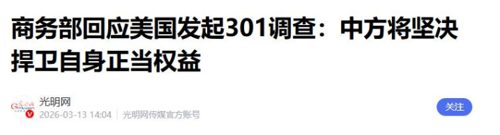 2.《商务部回复好意思国发起301拜谒:中方将顽强捍卫自身高洁权利》2026-03-13 14:04 | 开端:光明网