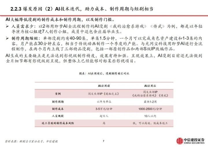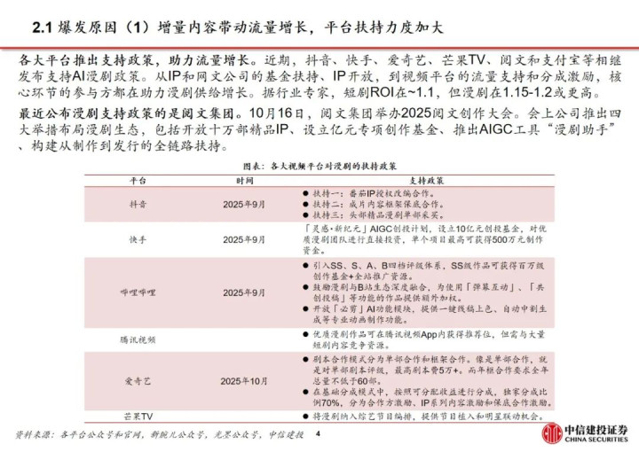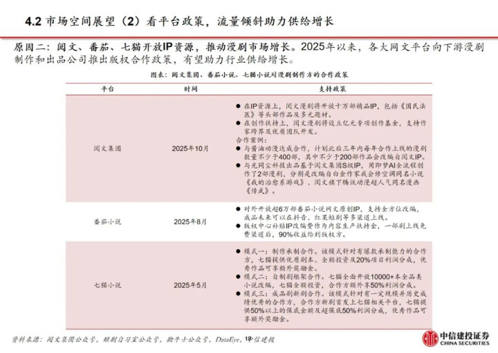 细腻爆发原因,一是收获于AI发展,漫剧在制作本钱、制作周期等方面并排真东说念主短剧,成为微短剧阛阓增量;二是长中短视频平台的流量扶握,高ROI驱动供给增长。