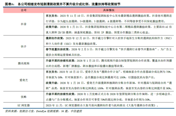 跟着行业界限高增,漫剧全产业链加快布局。自2025年下半年,网文IP公司、出品公司、视频平台等漫剧行业的各法度参与方对行业的插足握续加多。看上游网文IP公司,多是双线布局。一方面平直下场诈欺储备丰富的网文资源参与漫剧创作;另一方面向第三方制作公司灵通版权库,争取和洽共赢。看中游出品公司,繁密短剧公司在2025年上半年切入漫剧赛说念,下半年稳步扩大坐褥材干,从供给端驱动阛阓快速增长。看卑轻篾频平台,抖音、腾讯视频、爱奇艺等长中短视频平台束缚升级针对漫剧的流量扶握、分账比例等政策。视频平台从流量端进行算法分发并赐与漫剧更多曝光,鼓吹需求端的快速增长。