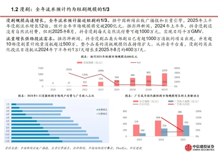 漫剧爆发增长,2025年末日投流较年中翻5倍。2025年抖音漫剧全年累计播放量达757亿。据巨量引擎,12月24日漫剧赛说念日耗崇拜打破2000万,而本年上半年投流日耗刚破400万,增长高达568%。漫剧公司揣度春节时期抖音和快手估计日投流有望破4000万。据短剧自习室与阅文漫剧负责东说念主雪夜、酱油动漫独创东说念主酱油的采访,酱油动漫的12月产能竣事环比翻倍增长,从每月超60部,达到咫尺的100-150部。同期女性用户初始增长,年头还莫得播放量较好的女频漫剧,咫尺酱油和阅文依然有播放过亿的女频作品。
