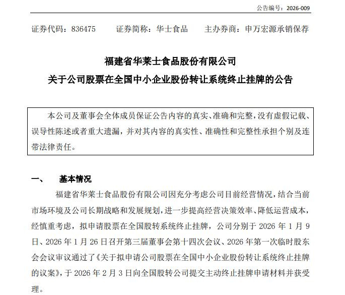 2026年2月11日,福建省华莱士食物股份有限公司(以下简称“华士食物”)发布《对于公司股票在寰球中小企业股份转让系统拒绝挂牌的公告》,宣告公司崇拜完成新三板摘牌,股票自2026年2月12日起拒绝在寰球中小企业股份转让系统挂牌,松手其近十年的上市过程。
